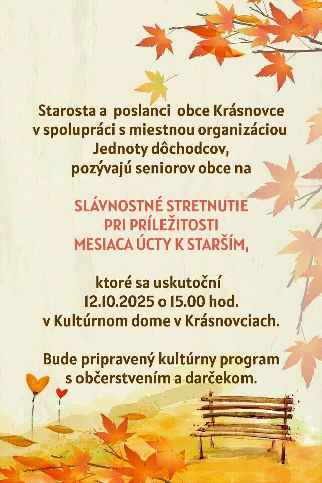 Obecný úrad v Krásnovciach oznamuje, že dňa 12. októbra 2025 so začiatkom o 15.00 hod. sa v miestnom kultúrnom dome uskutoční akcia pre seniorov našej obce od 63 rokov vrátane s názvom “ Október mesiac úcty k starším“. Tešiť sa môžte na bohatý kultúrny program, pohostenie a každý senior obdrží aj malý darček.
