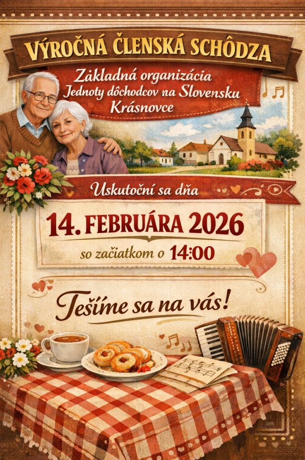 srdečne vás pozývame 14. februára 2026 so začiatkom o 14:00 hod. na výročnú členskú schôdzu, ktorá sa uskutoční v Kultúrnom dome. Všetci členovia ste srdečne pozvaní.