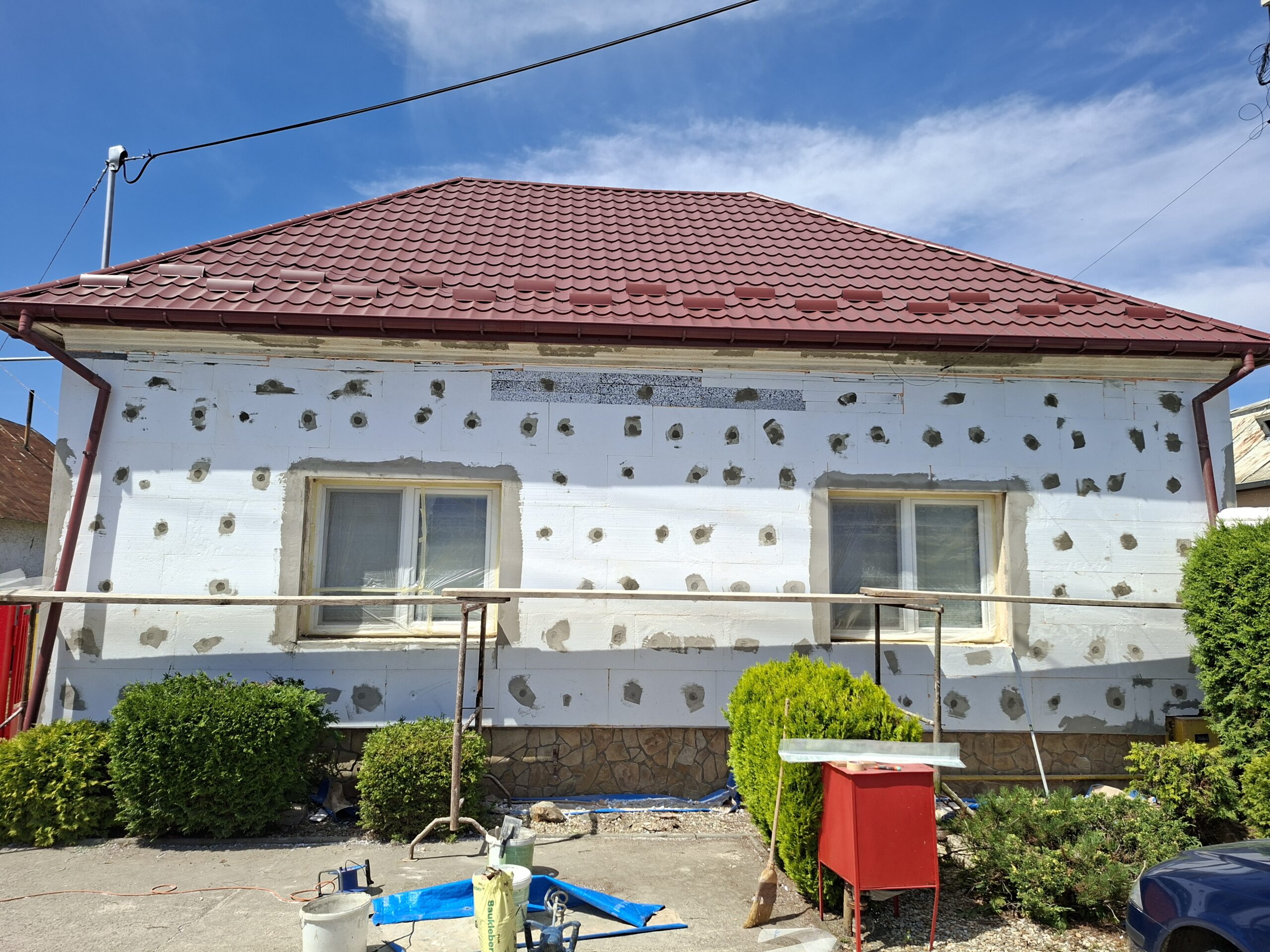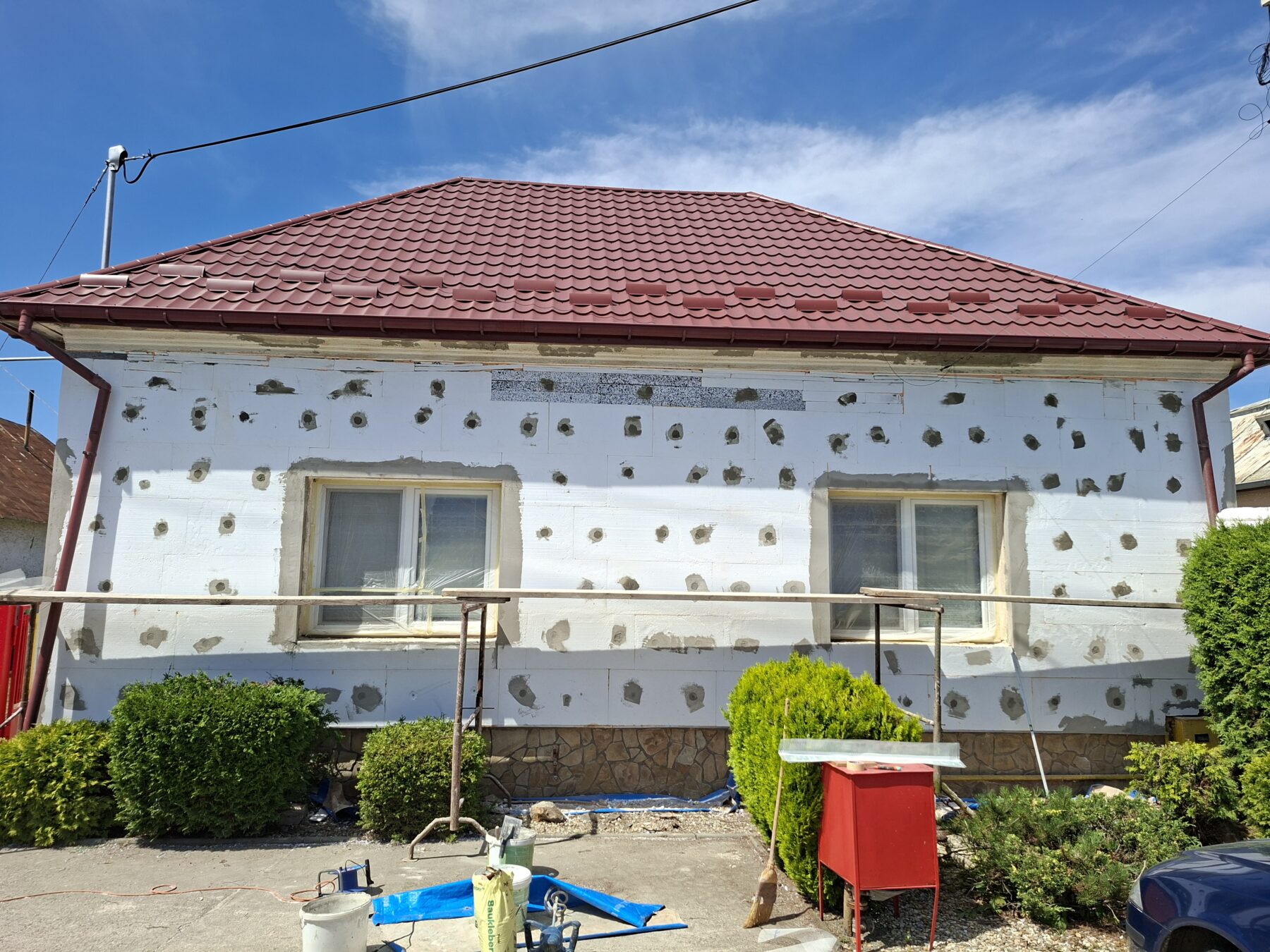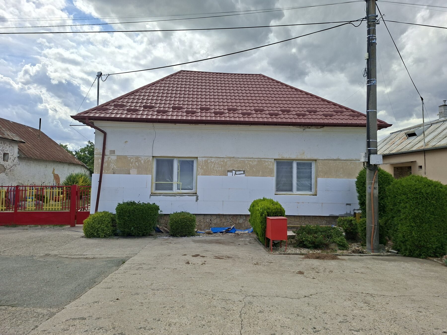 pred dvomi týždňami sme sa pustili do menšej rekonštrukcie prednej steny na miestnej materskej škôlke, nakoľko už bola potrebná oprava. A takto to vyzerá po rekonštrukcii: